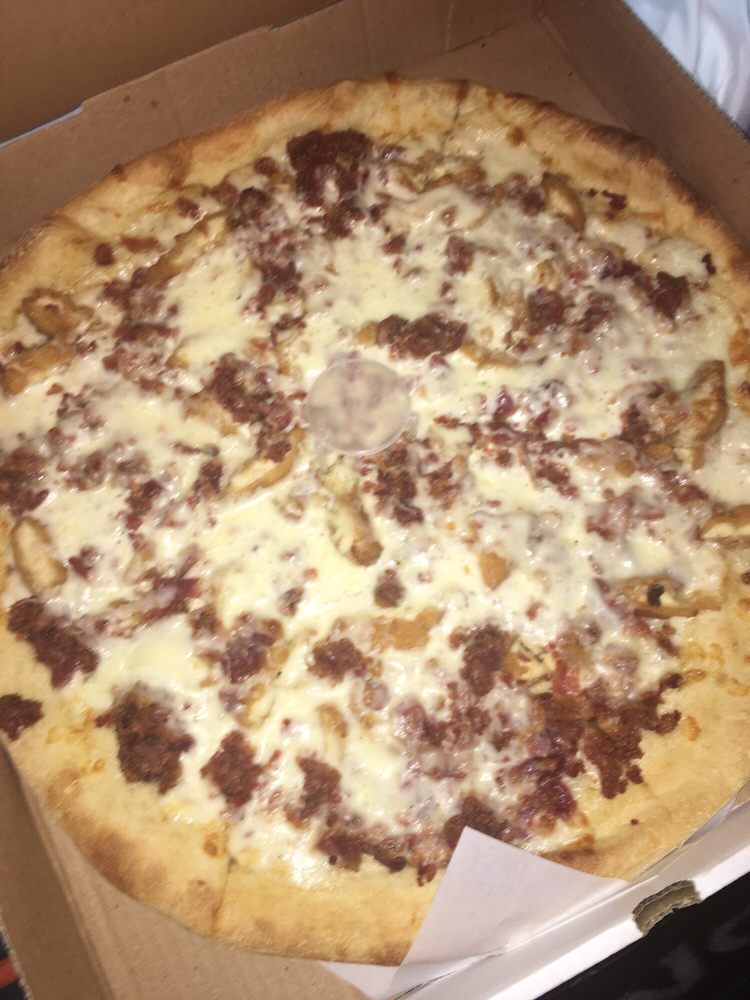 Ham, salami, pepperoni, mushrooms, green peppers, onions, cheese sauce.